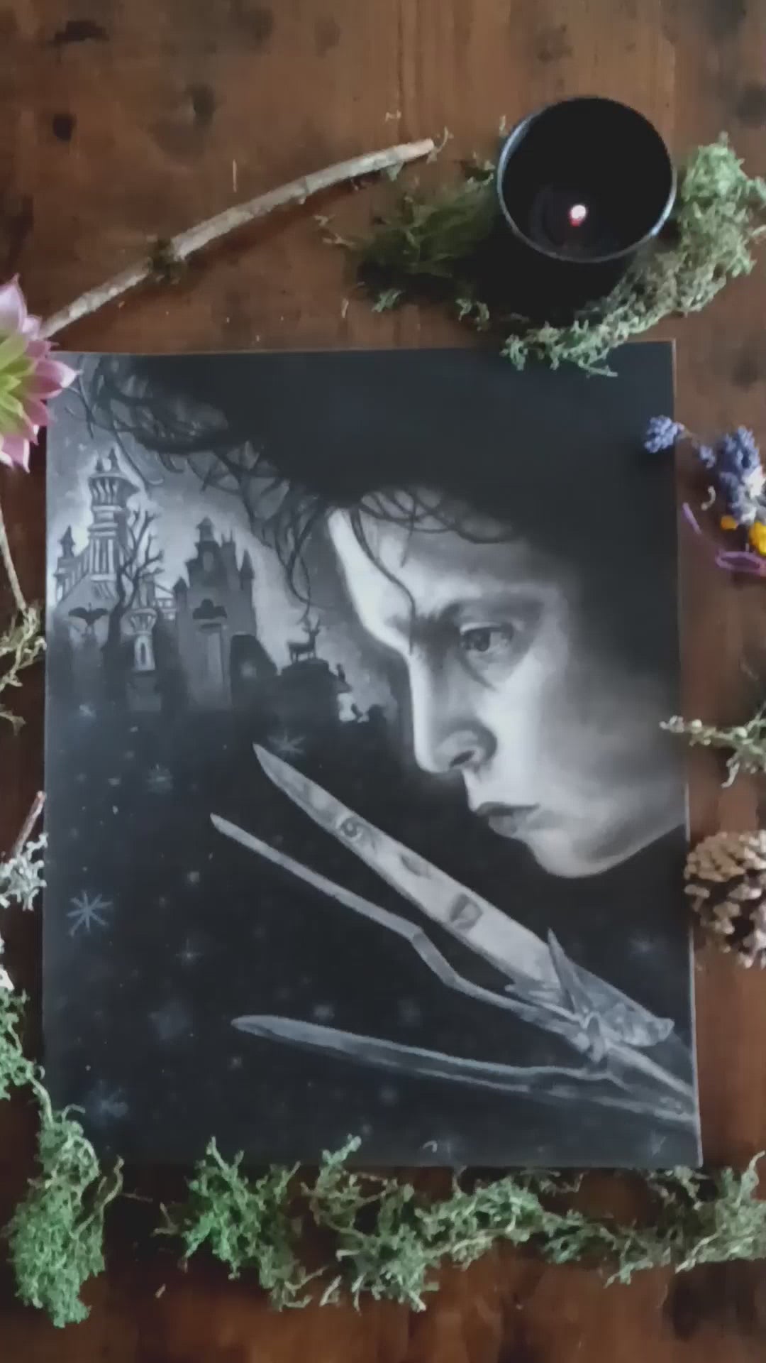 This captures the dark essence of Tim Burton's iconic 1990 film. Perfect for fans, this features Edward's hauntingly gentle expression, evoking nostalgia for this beloved film. He is very lonely in his castle and he'd love a new friend! Will that be you?
